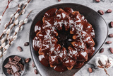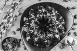 Easter cake with chocolate, spring flowers on a stone background. Happy Easter celebration. Top view, flat lay