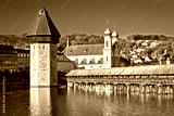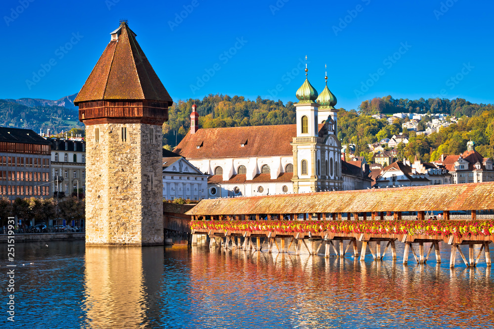 Kapellbrucke historic wooden bridge in Luzern and waterfront landmarks view