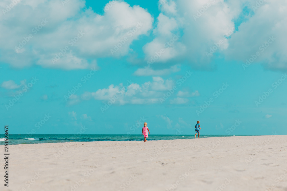 little boy and girl walk on beach, family on vacation at sea