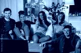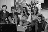 friendship, leisure, people and entertainment concept - happy friends watching tv at home in evening