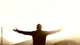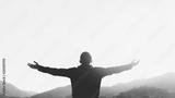 Copy space of man rise hand up on top of mountain and sunset sky abstract background.