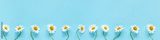 Row of white chamomiles daisies flowers on pastel blue color paper background Copy space Template for postcard, lettering, text or your design Flat lay Top view