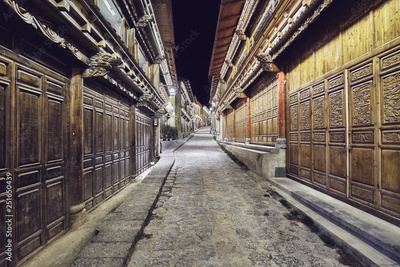 Illuminated empty street of Shangri La Old Town (Dukezong) at night, China.