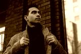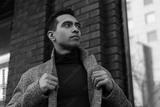Successful fashion model wearing stylish grey coat and purple turtleneck walking along urban street in New York city. Handsome African American man with emotional face waiting for taxi outdoors