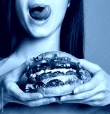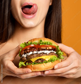 Fast food concept. Tasty unhealthy burger sandwich in hands hungry mouth getting ready to eat