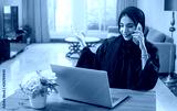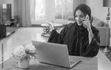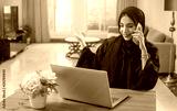 Pretty young middle eastern woman talking on mobile phone and using laptop at home