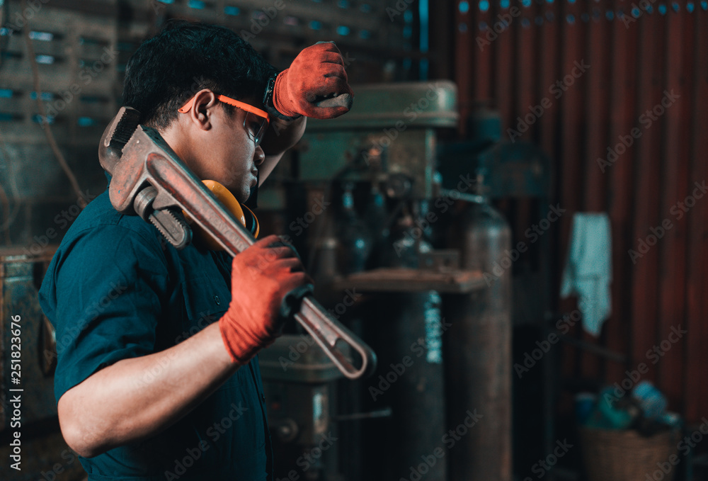 Engineer taking a break while working and wiping perspiration from his head with his safety gloves