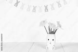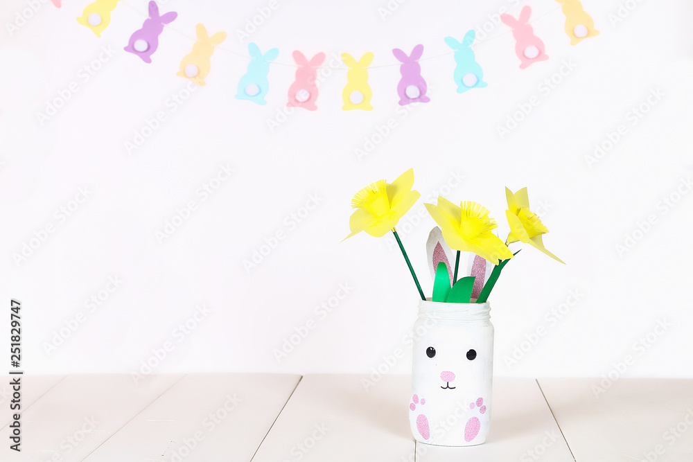 Diy Easter garland bunnies, flags EASTER made paper white wall background. Gift idea, decor Easter