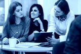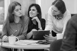 Students doing common project for their studies together. Girls learning foreign language together on courses in private school. Colleagues working under interesting presentation and drinking tea.