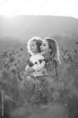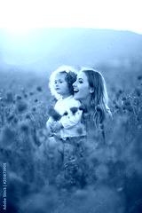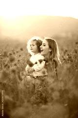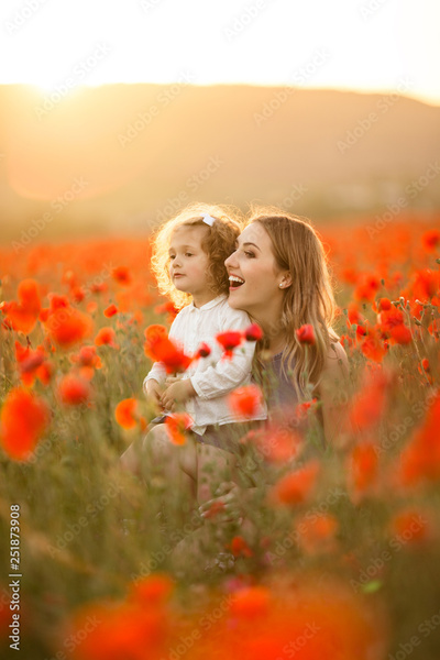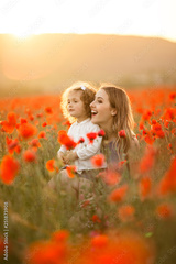 Beautiful smiling child girl with mother are having fun in field of red poppy flowers over sunset lights, spring time