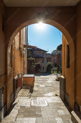 Rome (Italy) - The suggestive popular Garbatella quarter in Ostiense district, an agglomeration in Rococo style with gardens and the famous modern bridge named Settimia Spizzichino
