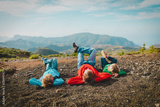 happy father with kids relax in mountains, nature travel
