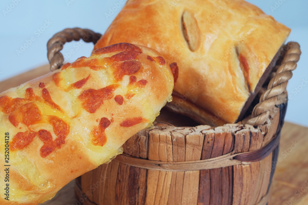 Tasty homemade cheese bread on white background