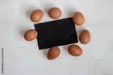 Easter eggs with blackboard on wooden background.