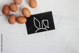 Easter eggs with blackboard on wooden background.