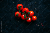 Bunch of fresh tomatoes isolated on black texture background. Flat lay. Top view