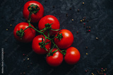 Flat lay of fresh tomatoes on branch isolated on black texture background. Close up. Ripe vegetables