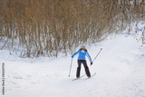 An amateur sportswoman learns to ski on a mountain, ski poles in different directions.