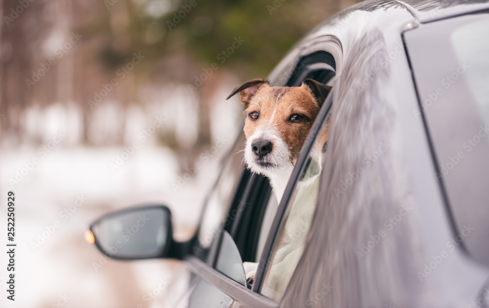 Sad dog looking from car window rides away by winter road