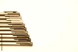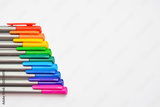 Set of colorful pens, exactly lying diagonally in the left side of the photo with copyspace