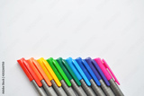 Set of colorful pens, exactly lying diagonally in the bottom side of the photo with copyspace