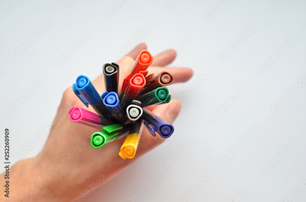 Set of colorful pens holding in man's hand like sign OK, top view on black background