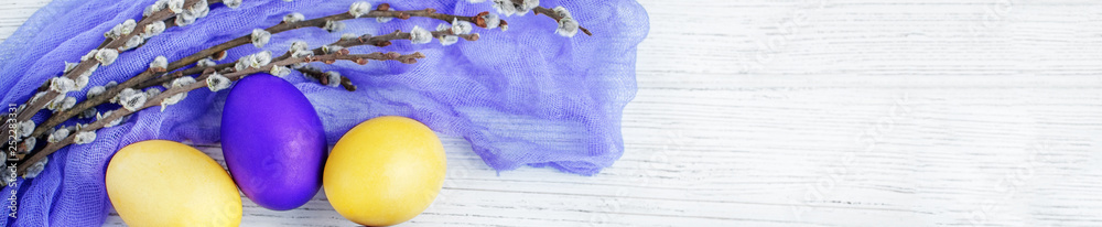 Yellow and purple eggs and willow. Congratulations. Banner.