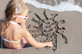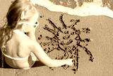 Kid is drawing smiling sun on sand at beach. Concept of children picture, sand painting at summer vacation, holiday and travel. Little girl is sitting in waves outdoors. Child is enjoying summertime.