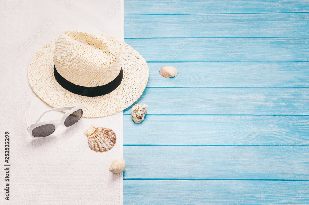 Top view of blue planks marine pier near the beach. Frame composition with summer accessories. Background with copy space and visible wood texture. Border composition