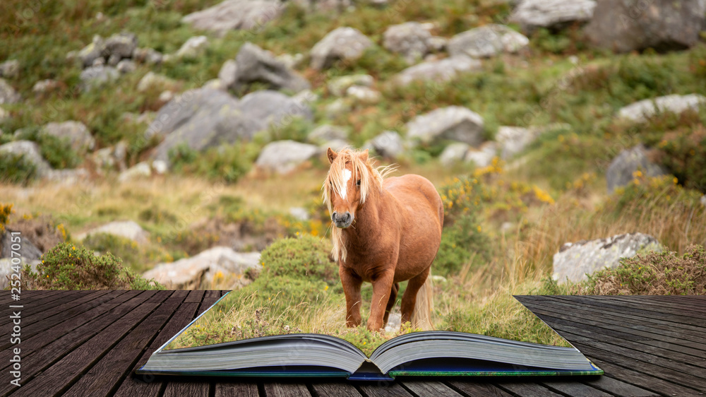 Stunning image of wild pony in Snowdonia landscape in Autumn coming out of pages of open story book