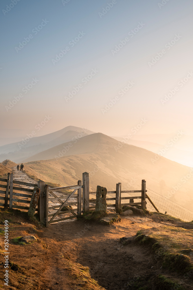 Stunning Winter sunrise landscape image of The Great Ridge in the Peak District in England with a cloud inversion and mist in the Hope Valley with a lovely orange glow