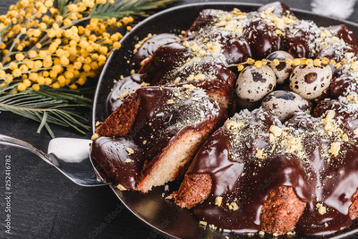 Easter cake with chocolate, coconut, spring flowers, quail eggs on a dark stone background. Happy Easter celebration