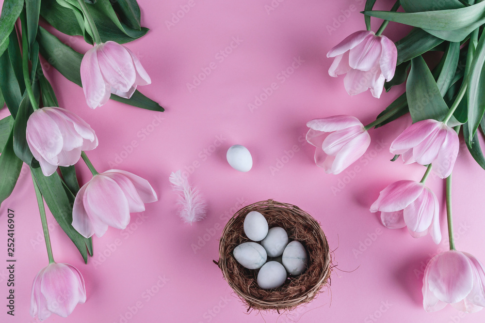 Easter eggs in nest and tulip flowers on spring background. Top view with copy space. Happy Easter card