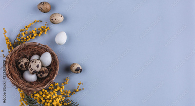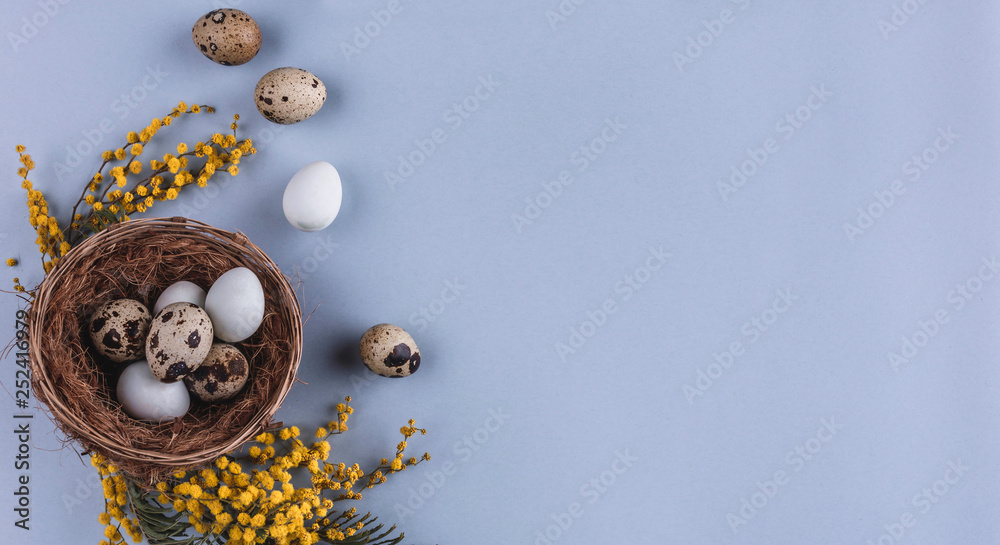 Easter eggs in nest and spring flowers on holiday background. Top view with copy space. Happy Easter card