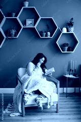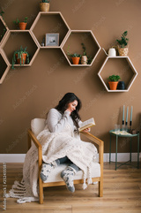 Happy woman enjoying reading a book sitting on armchair in the home room
