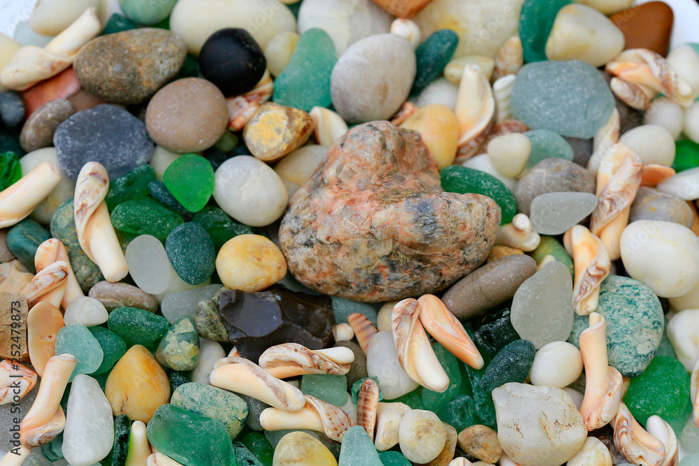 Stones, glass, seashells, polished by sea waves and a stone in the form of a heart