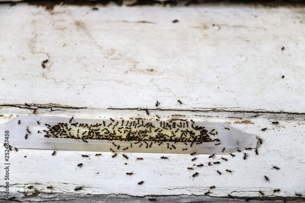 Ant poison trap filled with ants - dead and alive - sitting on old wood - shallow focus
