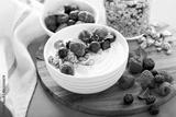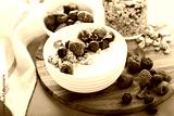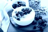 Plain yougurt with granola and berries on side, fresh, healthy and colorful breakfast
