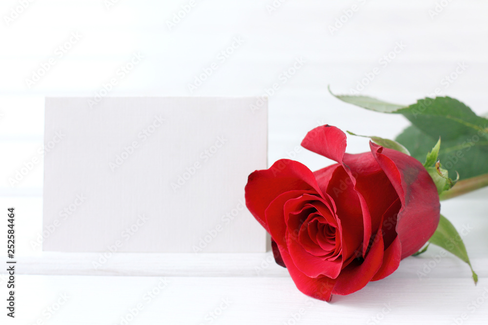 red rose on the background of a blank card with a place for the inscription front view . tender wishes