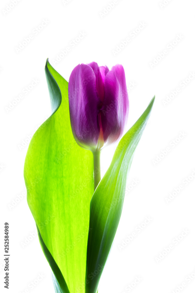 Single purple (violet) tulip isolated on white with backlight.