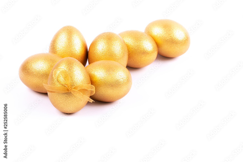 Golden colored Easter eggs isolated on white background. Place for text.