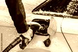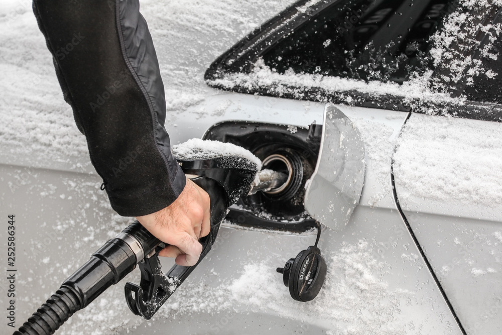 Detail on man's hand holding fuel nozzle, filling gas tank of car covered with snow in winter