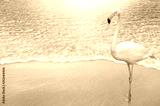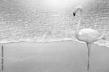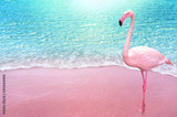 pink flamingo bird sandy beach and soft blue ocean wave summer concept background