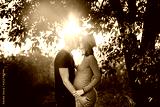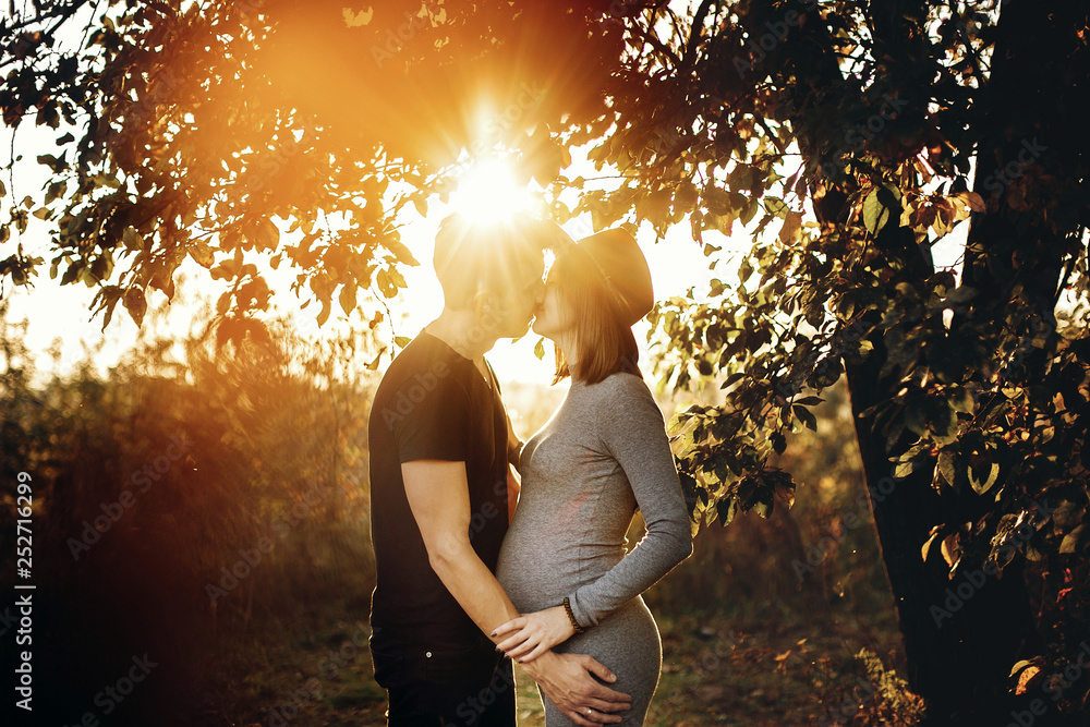 Stylish pregnant couple holding hands on belly and embracing in sunny light in autumn park under tree. Happy young parents, mom and dad, hugging baby bump, enjoying beautiful moment at sunset