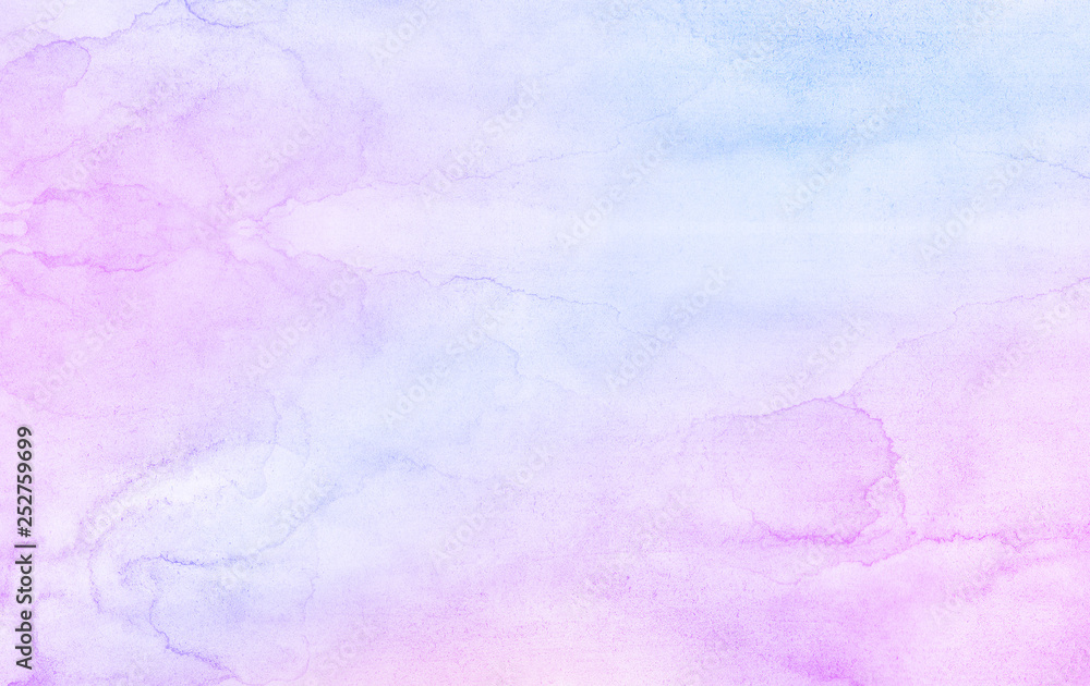 Fantasy pastel ink colors wet effect hand drawn canvas aquarelle background. Smooth light pink, purple shades and blue watercolor paper textured illustration for grunge design, vintage card, templates