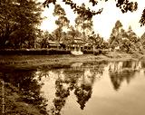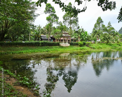 Scenic overgrown pond with a stone gazebo on the shore, in cloudy weather, Phang Nga, Thailand.
