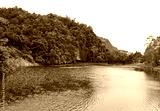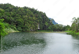 Scenic overgrown pond under the mountain with the jungle, in cloudy weather, Phang Nga, Thailand.