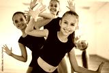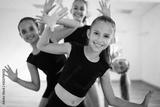 Group of young fit dancers practicing during class school