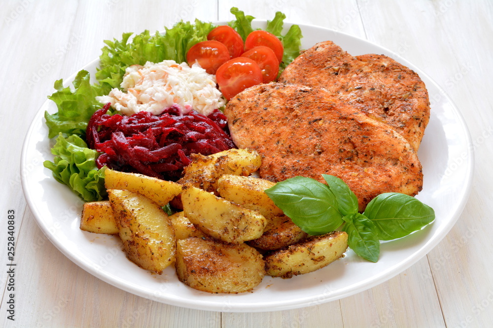 filety z kurczaka pieczone z ziemniakami i surówkami