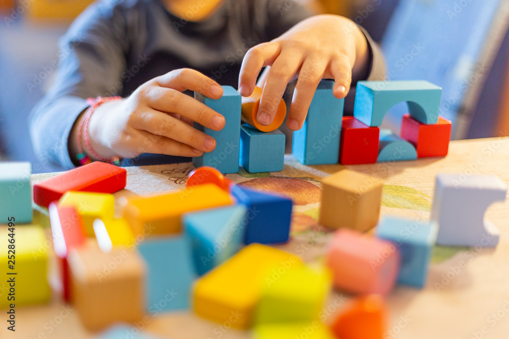 a child plays with colored wooden blocks at home.kid plays and builds buildings and towers with wooden colored blocks.